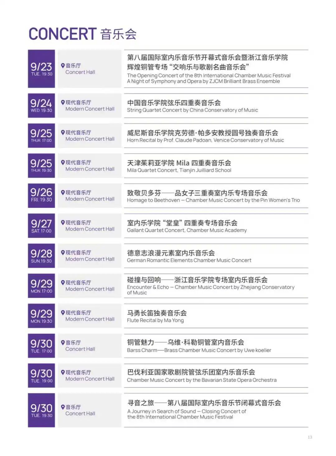 9月23日至30日,第八届国际室内乐音乐节由浙江音乐学院、中国交响乐发展基金会联袂主办,浙江音乐学院管弦系、艺术处、国际交流合作处承办。本届音乐节采取音乐会、大师班和学术讲座等形式,以国际化视野为室内乐艺术搭建高规格、高水平的艺术实践平台,旨在培养出更多优秀的室内乐演奏人才,推动室内乐艺术在中国的发展。