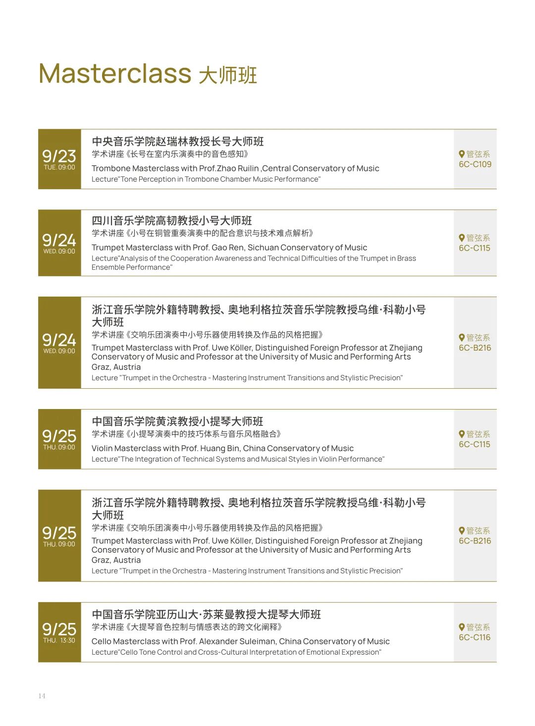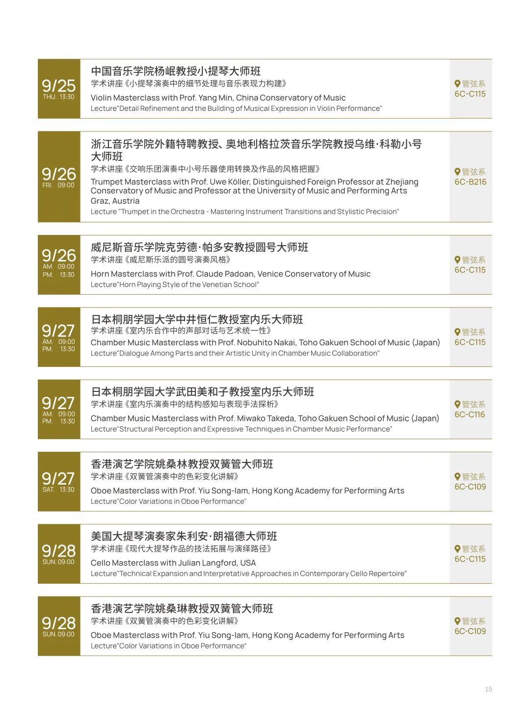 本届音乐节汇聚了来自中国、意大利、日本、德国等多个国家的音乐家与院校参与。包括中央音乐学院、中国音乐学院、天津茱莉亚学院、浙江音乐学院、四川音乐学院、威尼斯音乐学院、日本桐朋学园大学、香港演艺学院等国内外知名音乐学府。音乐节涵盖多场大师班及音乐会,呈现铜管、弦乐、室内乐等多种形式的精彩演出,展现国际音乐交流的丰富内涵。