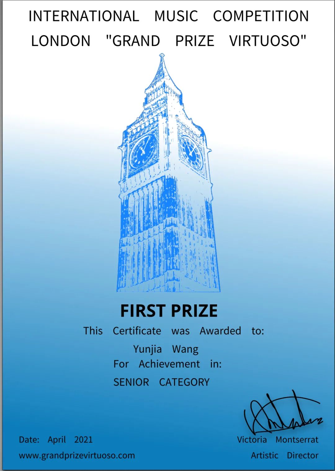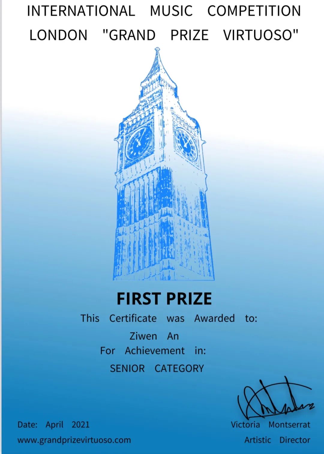 管弦182班安子文(小号)在英国伦敦“艺术家大奖”国际音乐比赛(International Music Competition London GrandPrize Virtuoso)中荣获一等奖(最高组别)。
