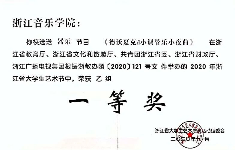 管弦系学生王禀杰、闫泰之、王宇萌、王晓通、丁思中、张晟阳、田泽辉、叶宇轩、徐欢、杨理、陈童等在浙江省大学生艺术节重奏比赛中荣获一等奖。