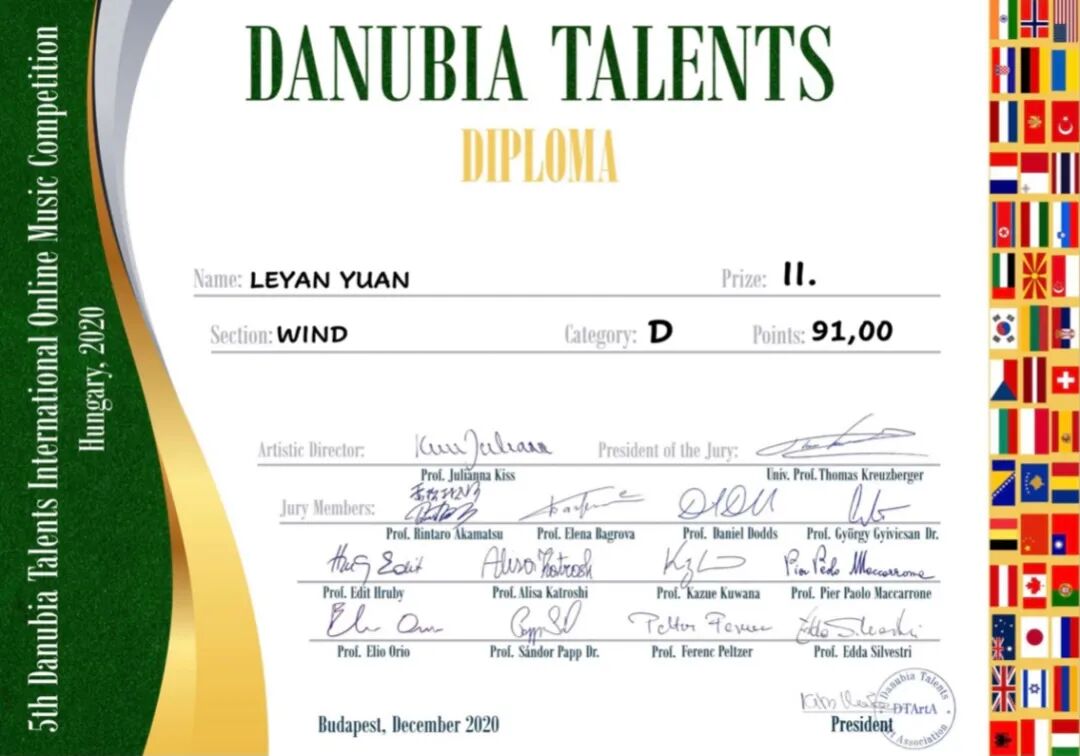 管弦191班袁乐晏(长笛)在2020年匈牙利第五届国际音乐大赛(线上)中荣获管乐D组第二名。