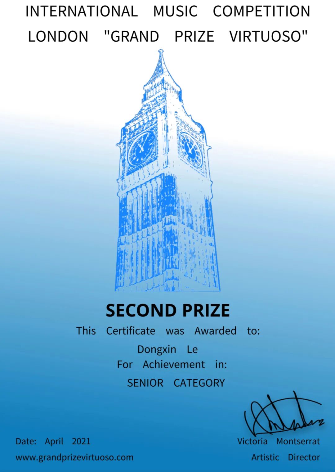 管弦182班乐东鑫(小号)在英国伦敦“艺术家大奖”国际音乐比赛(International Music Competition London GrandPrize Virtuoso)中荣获二等奖(最高组别)。