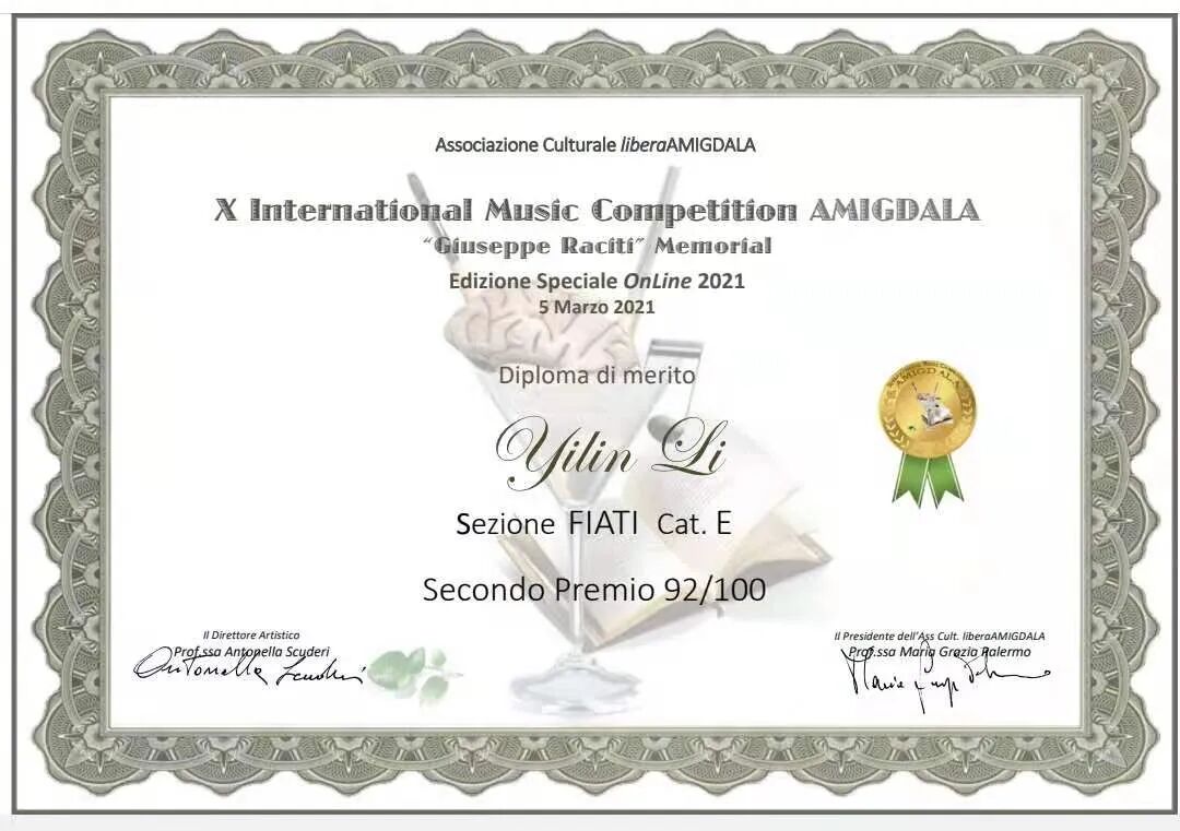 管弦181班李懿霖(单簧管)在2021年第10届意大利阿米格达拉-纪念拉奇蒂国际音乐比赛(InternationalMusic Competition AMIGDALA “Giuseppe Raciti" Memorial)(最高组别)中荣获二等奖。