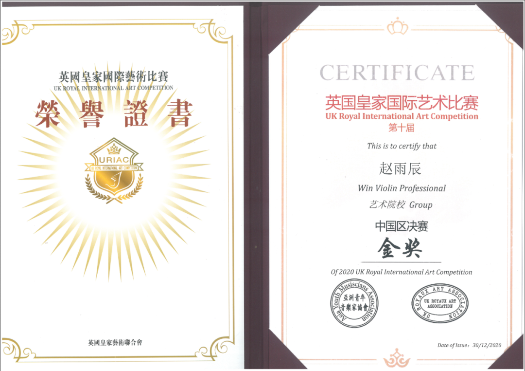 管弦183班赵雨辰(小提琴)在英国皇家国际艺术比赛中荣获金奖。