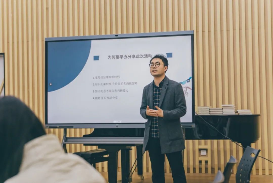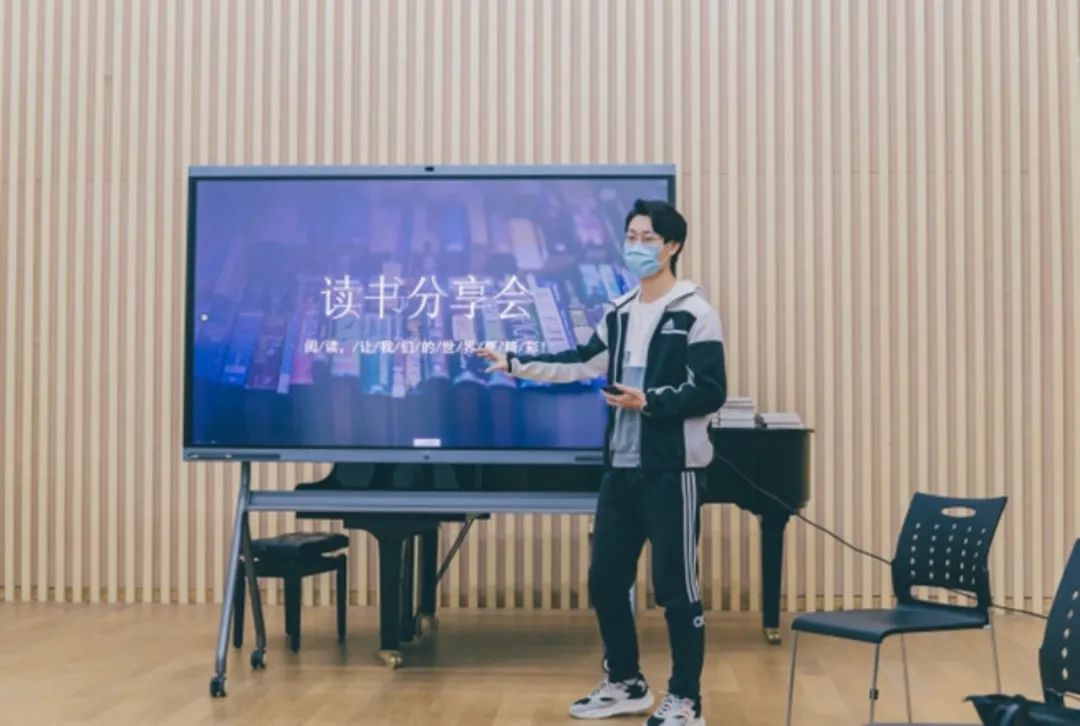 管弦211黄俊睿,管弦202李广明,203陈培钧,沈聪尔,严倩涵同学分别上台与同学们分享书籍或是自己的读书感悟。其中黄俊睿同学分享了乔伊斯的代表作《都柏林人》,陈培钧同学提出阅读优秀的书籍能让我们发掘艺术的核心,更加触碰艺术领域真正的殿堂,并跟同学们分享了《理想国》、《圆圈正义》等书籍。以书会友,整场活动在轻松愉悦的氛围中展开。