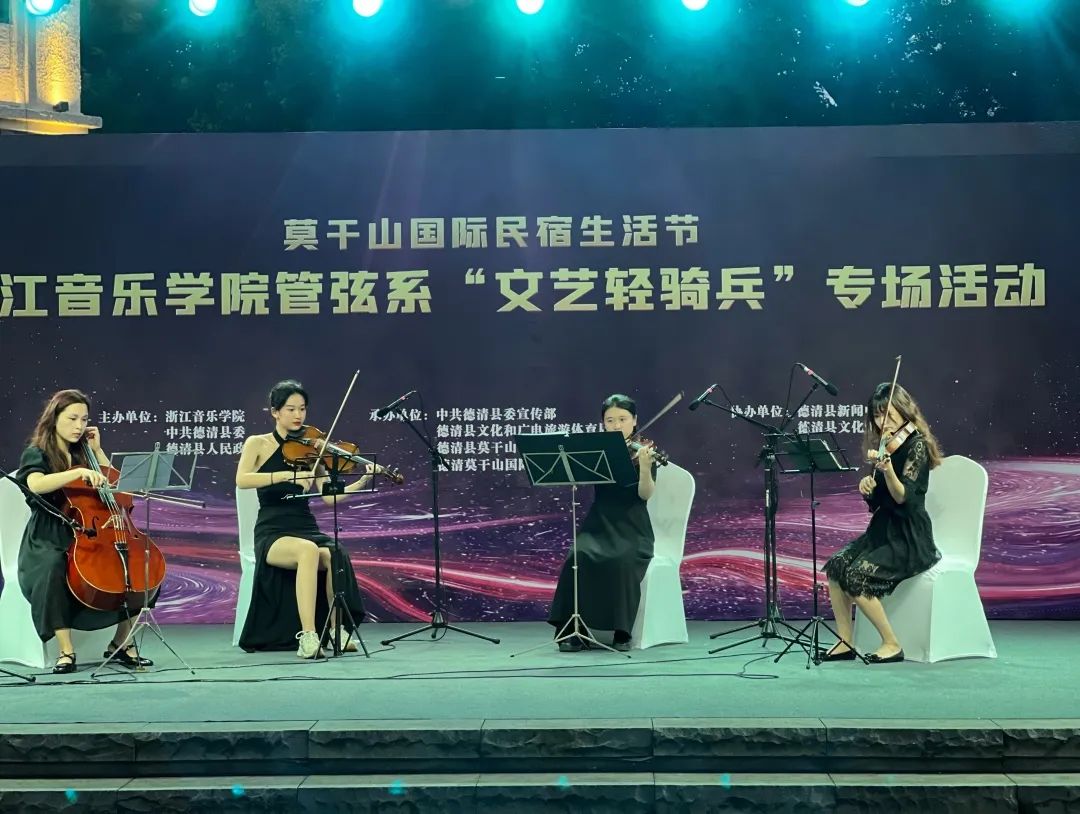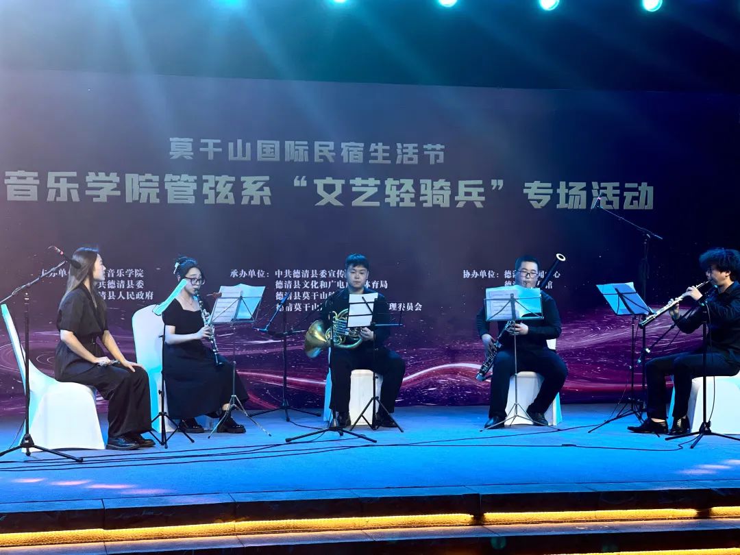当晚是“诗画江南 乐动德清”浙江音乐学院“文艺轻骑兵”专场演出,五位老师带来的木管五重奏《唱支山歌给党听》、《草原歌曲联奏》碰撞出了美妙的音乐回响在莫干山。