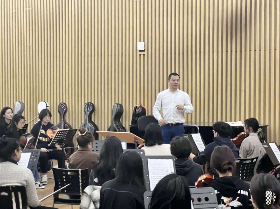 在排练中,张艺总监通过对作曲家生平经历的讲述,让乐团学生们更加了解作品的风格特色以及其传达的思想感情。同时,他还针对各声部存在的不同难点,一针见血地指出了演奏员们存在的不同问题,因材施教、对症下药,提出了针对性的的解决方法,并对同学们日常在声部分排和乐团合排练习中要解决的问题和最终应达到的效果做出了要求。