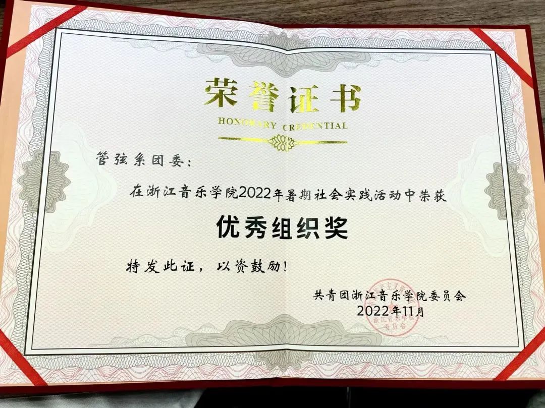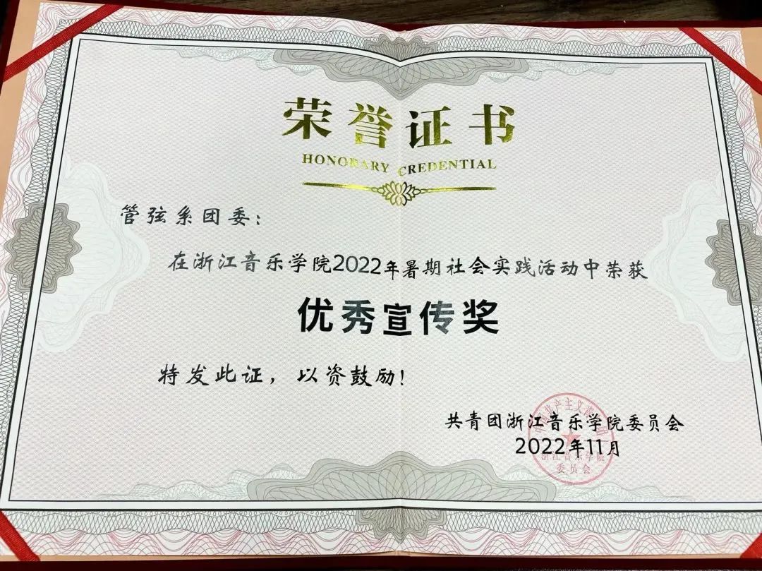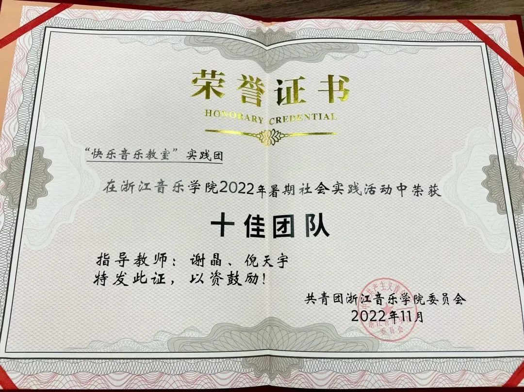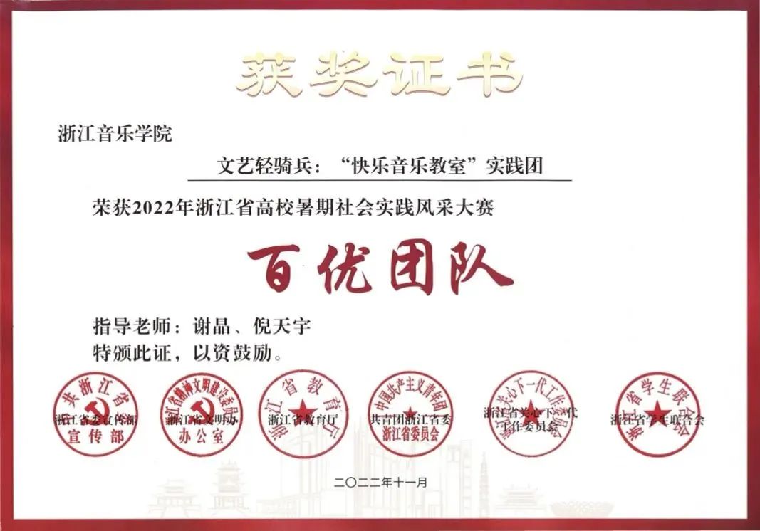 浙江音乐学院文艺轻骑兵“快乐音乐教室”实践团在由浙江省委宣传部、浙江省教育厅、共青团浙江省委等举办的2022年浙江省高校暑期社会实践风采大赛中荣获“百优团队”奖;并被浙江音乐学院共青团委评为暑期实践活动“十佳团队”,荣获“优秀宣传奖”和“优秀组织奖”