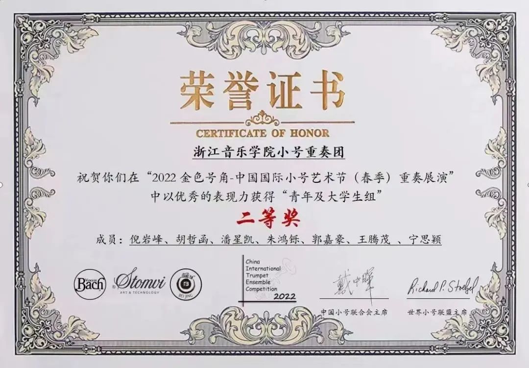 管弦系小号重奏团荣获2022中国国际小号艺术节重奏展演二等奖
