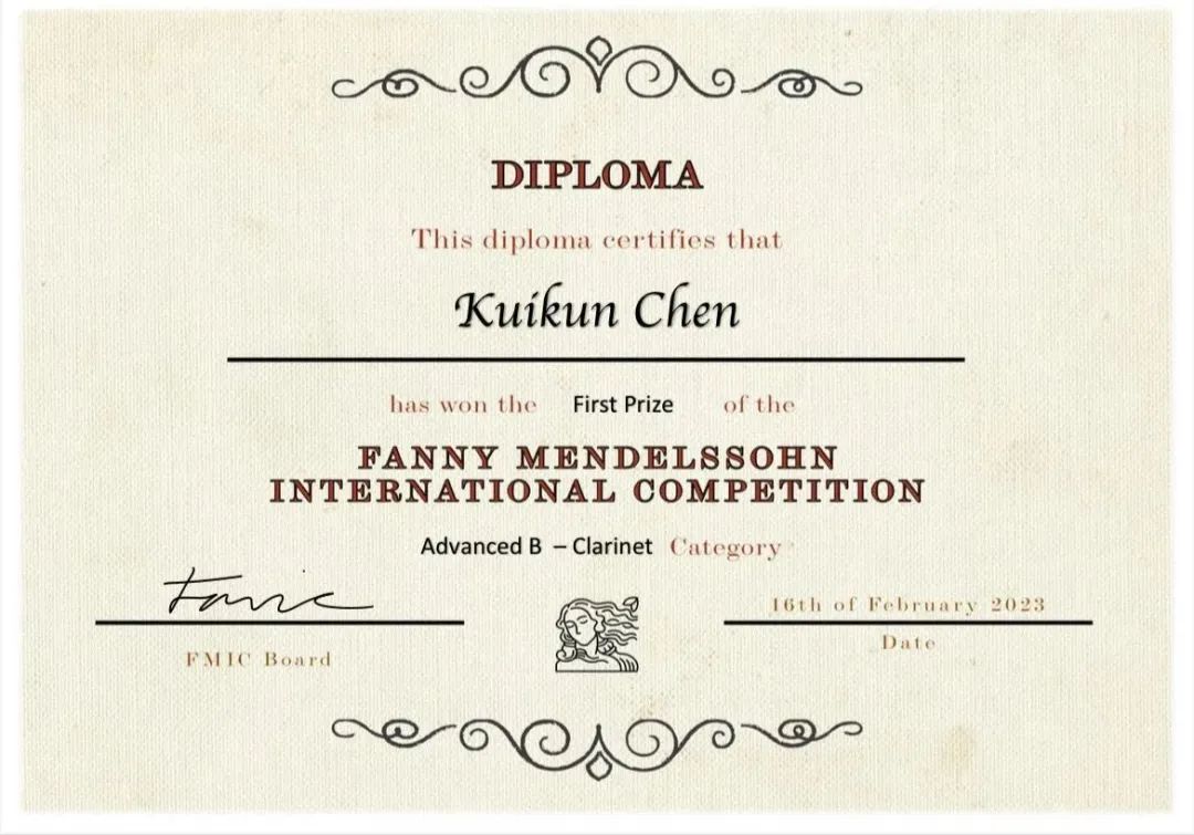 2023年2月,在范妮·门德尔松国际线上比赛公布的比赛结果中,浙江音乐学院管弦系2019级学生陈奎坤荣获单簧管一等奖。
