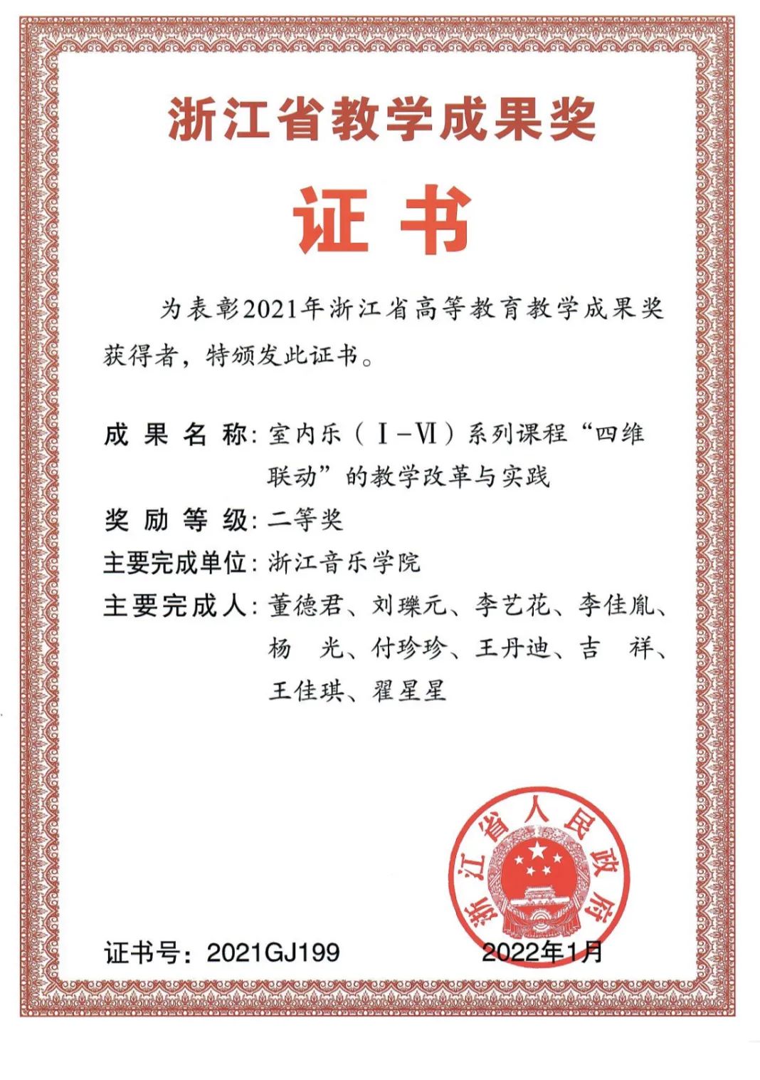 学生在中央音乐学院第十五届管乐室内乐木管独奏比赛中获单簧管独奏三等奖,在马萨第十届国际青年音乐家比赛中获管乐独奏E组特别一等奖、室内乐I组第一名,在第三十一届巴列塔国际青年音乐家大赛获得C组第一名,浙江大学生艺术节中获合奏乙组一等奖等数十项国内外赛事奖项。