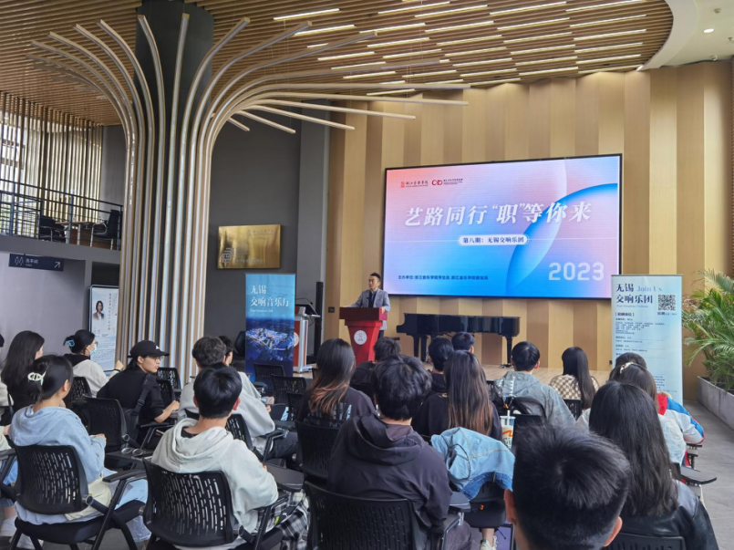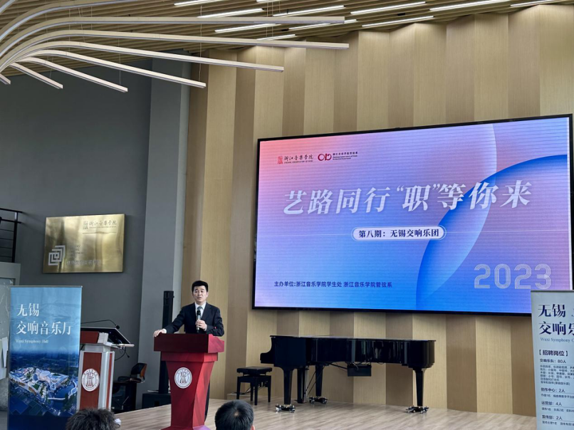 5月12日,“艺路同行,‘职’等你来”校园专场招聘会第八期在教师发展中心举行,本场招聘会由浙江音乐学院学生处、管弦系主办,特邀无锡交响乐团常务副团长尹锋来校作招聘宣讲。宣讲会由浙江音乐学院副院长、管弦系主任董德君主持。