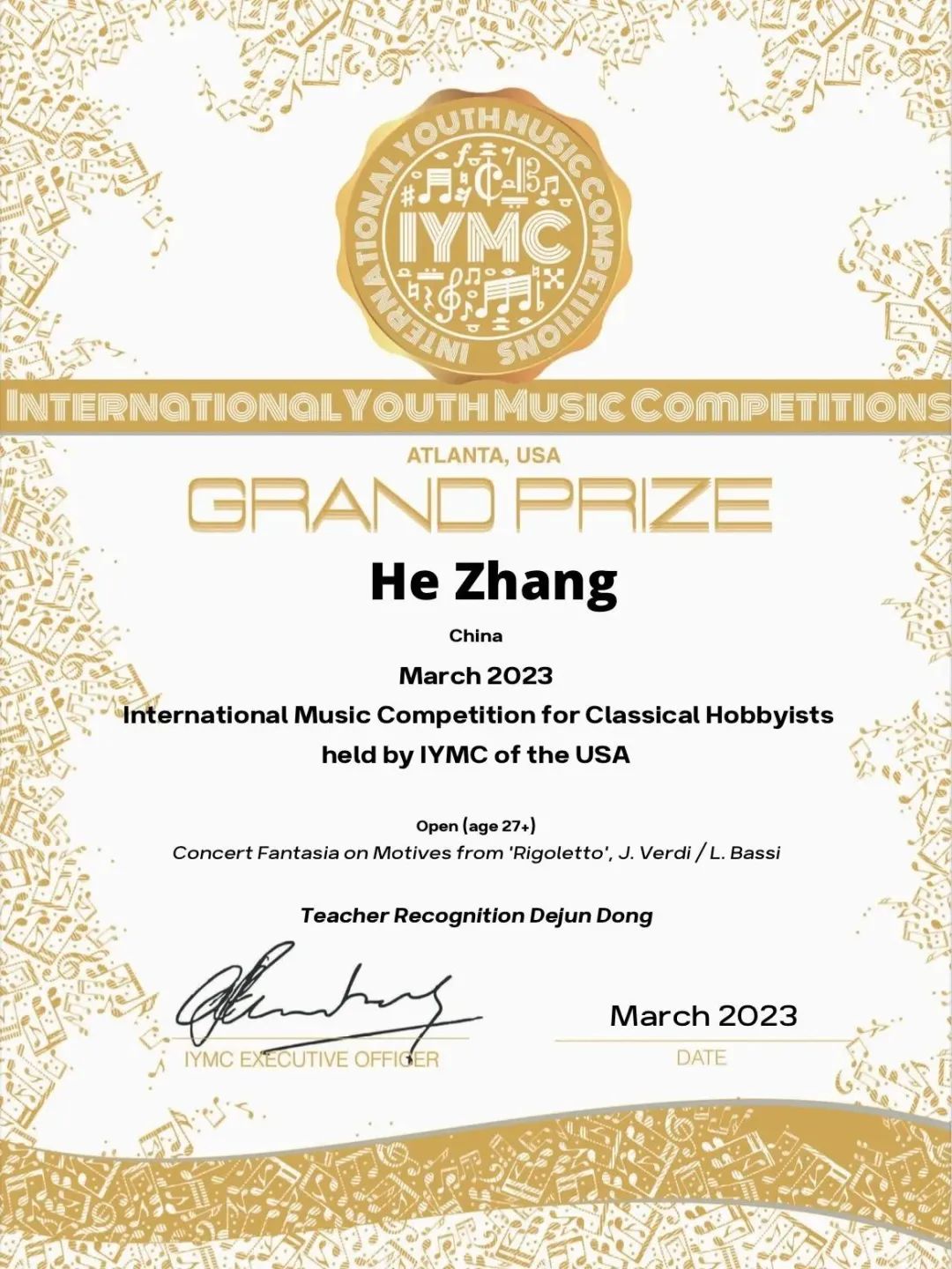 近日,美国IYMC国际青年音乐大赛落下帷幕,管弦系研究生张赫凭借《弄臣》主题幻想曲,以总分100的成绩荣获国际音乐比赛大奖(27岁以上组别),指导老师董德君教授荣获最佳教师奖。管弦系学生李聪、陈奎坤、杨欣雅组成的三重奏组合荣获国际音乐比赛大奖(学院组19-26岁),指导老师李艺花副教授。