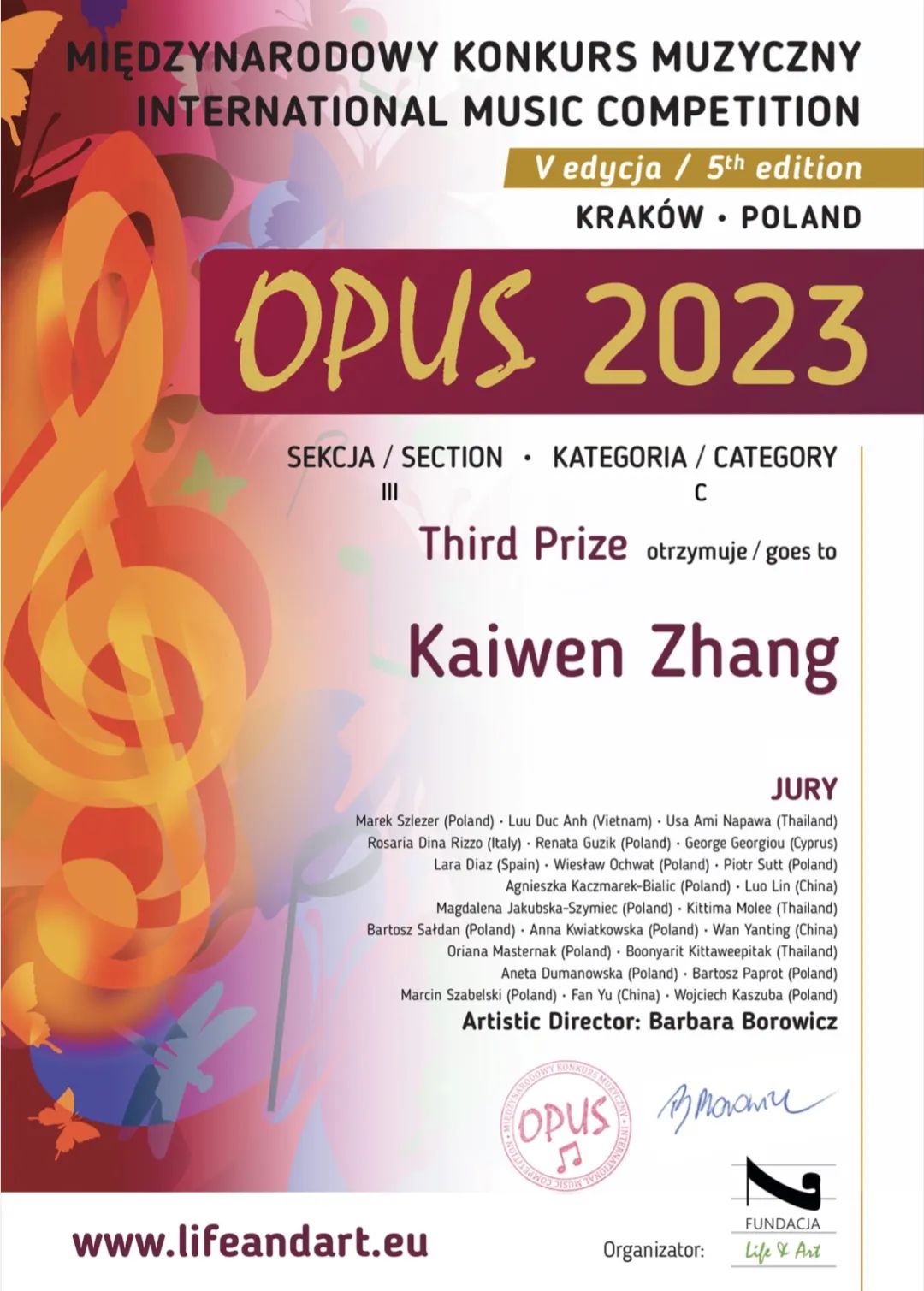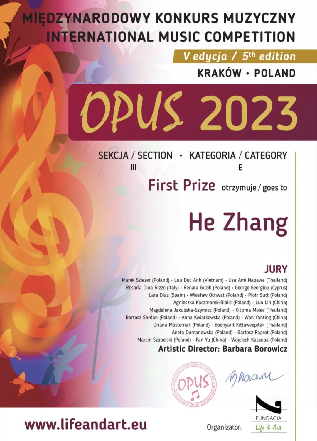 近日,在2023波兰国际青年音乐家音乐大赛公布的结果中,浙江音乐学院管弦系研究生张赫荣获E组一等奖,指导老师董德君教授。浙江音乐学院管弦系2022级学生张锴文获C组三等奖,指导老师范瑜。