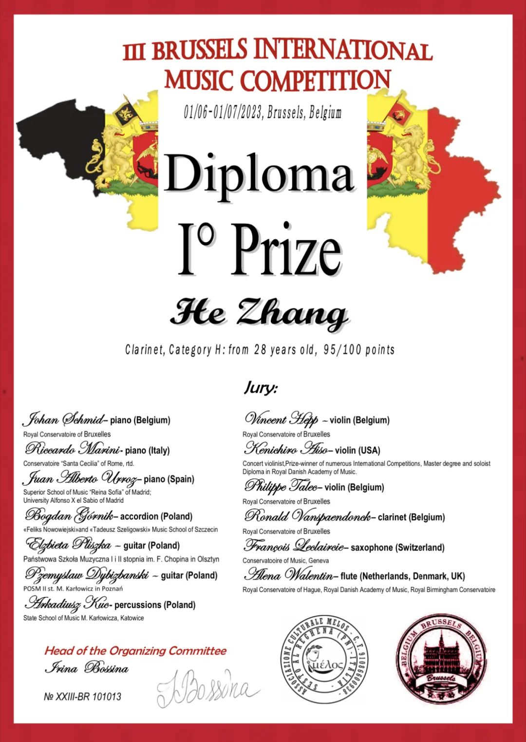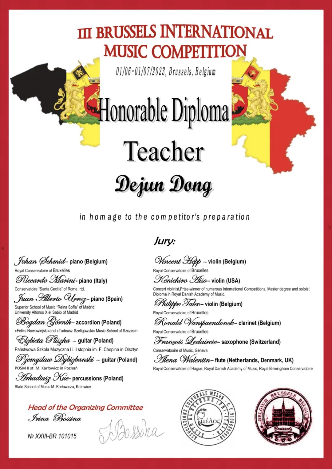 近日,2023比利时国际音乐大赛落下帷幕,管弦系研究生张赫,以总分95/100的成绩荣获一等奖,指导老师董德君教授荣获荣誉教师奖。