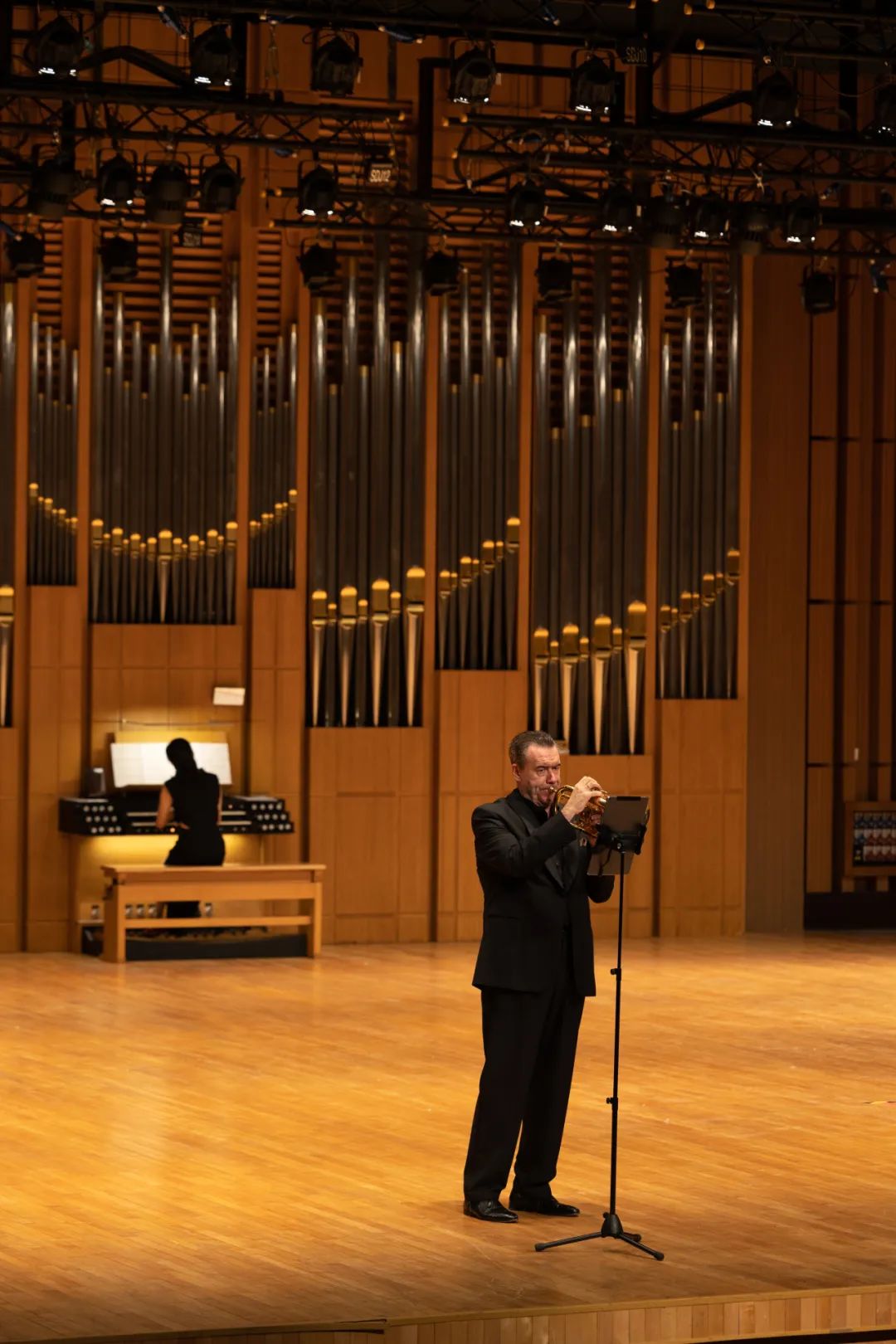 第五首《让音乐继续缭绕——为小号与管风琴》由乌维·科勒教授李艺花老师联袂出演,乌维·科勒教授用富鲁格小号演奏出的温暖圆润的音色与管风琴的恢弘巧妙结合,可谓绕梁三日不绝于耳,此首略带爵士风格的作品使观众魂牵梦绕。