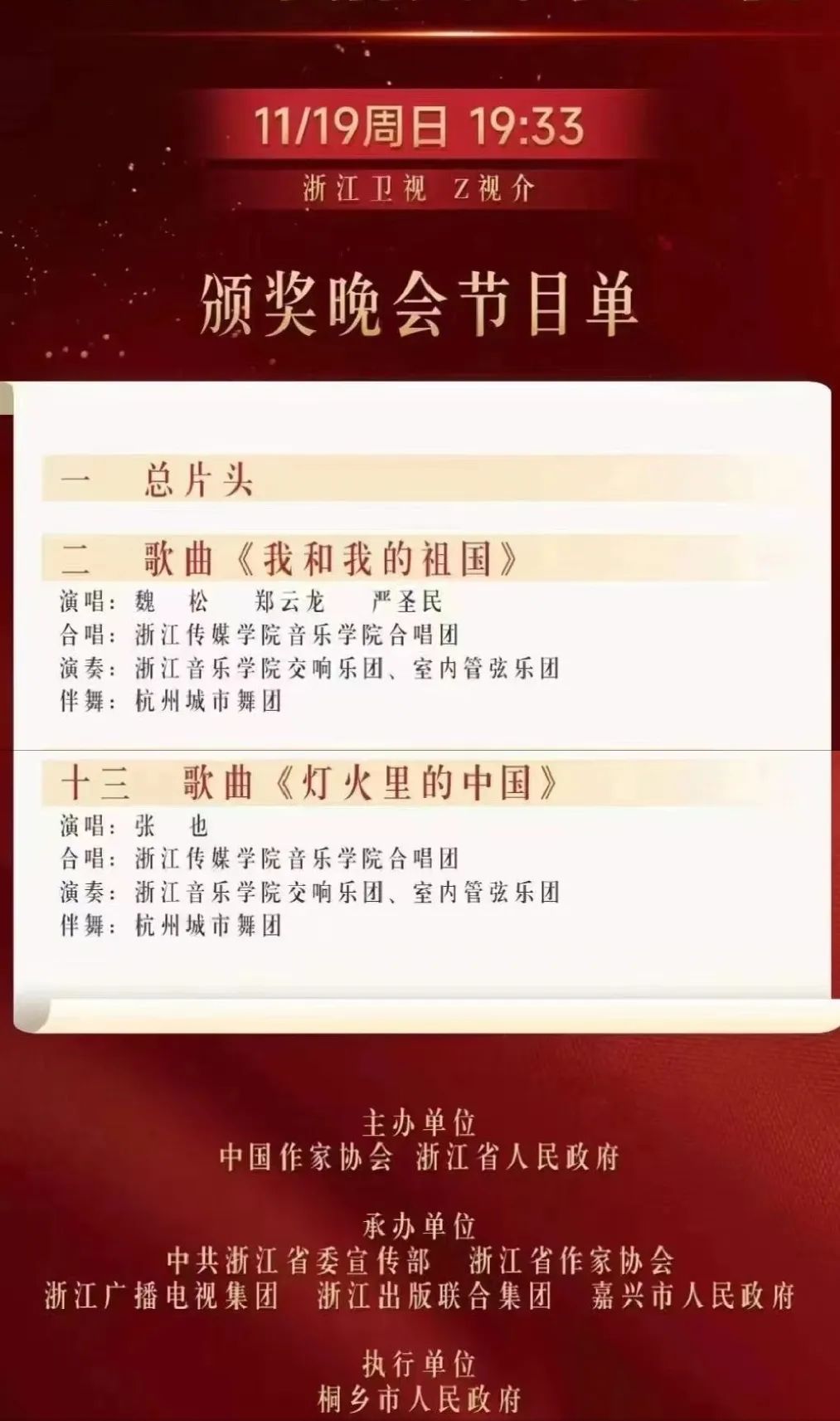 当晚,浙江音乐学院交响乐团和室内管弦乐团的成员们以精湛的技艺和深情的演绎为歌曲《我和我的祖国》《写故事的人》《灯火里的中国》进行伴奏,并在五位获奖作家的颁奖礼上进行演奏,一首首经典曲目配合着独属于获奖作品的主题短片,美妙的音乐渲染了整场的气氛,令现场观众沉醉其中,难以忘怀。演出还得到了相关部门和领导的一致好评,乐团富有朝气、活力的精神面貌给大家留下了深刻印象。