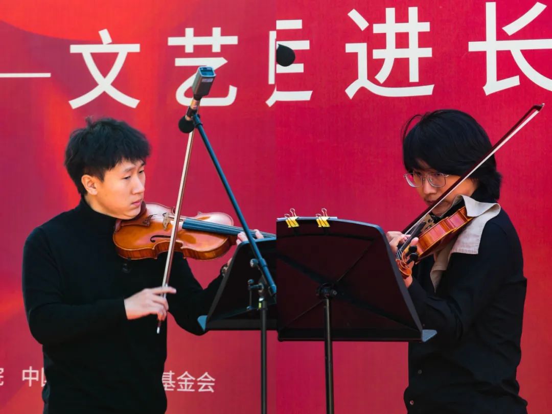 伴随长埭村村民热情的掌声,由张贺中、吉雅图、丁玉璇、李长威四位同学组成的弦乐四重奏率先为大家带来莫扎特最著名的《G大调弦乐小夜曲》,拉开了音乐会的帷幕。活泼流畅的节奏和短促华丽的八分音符颤音组成欢乐的旋律,一出场就点燃了现场的气氛。第二首演奏的是《启航随想曲》,该曲旋律歌唱性强,内涵简单易懂,纯正细腻且扣人心弦,在弦乐四重奏精彩演绎下,让观众在美妙的音乐声中无限遐想。曲风一转,弦乐四重奏带来陕北信天游的代表曲目之一《兰花花》,淳朴生动、犀利有力的演绎,充分展现了不畏社会压迫、敢于为爱情作斗争的坚强女性形象。弦乐四重奏组合以《我和我的祖国》作为结尾,这首耳熟能详的歌曲顿时让在场观众热血沸腾,让大家再次深感身为中国人的自豪与骄傲。