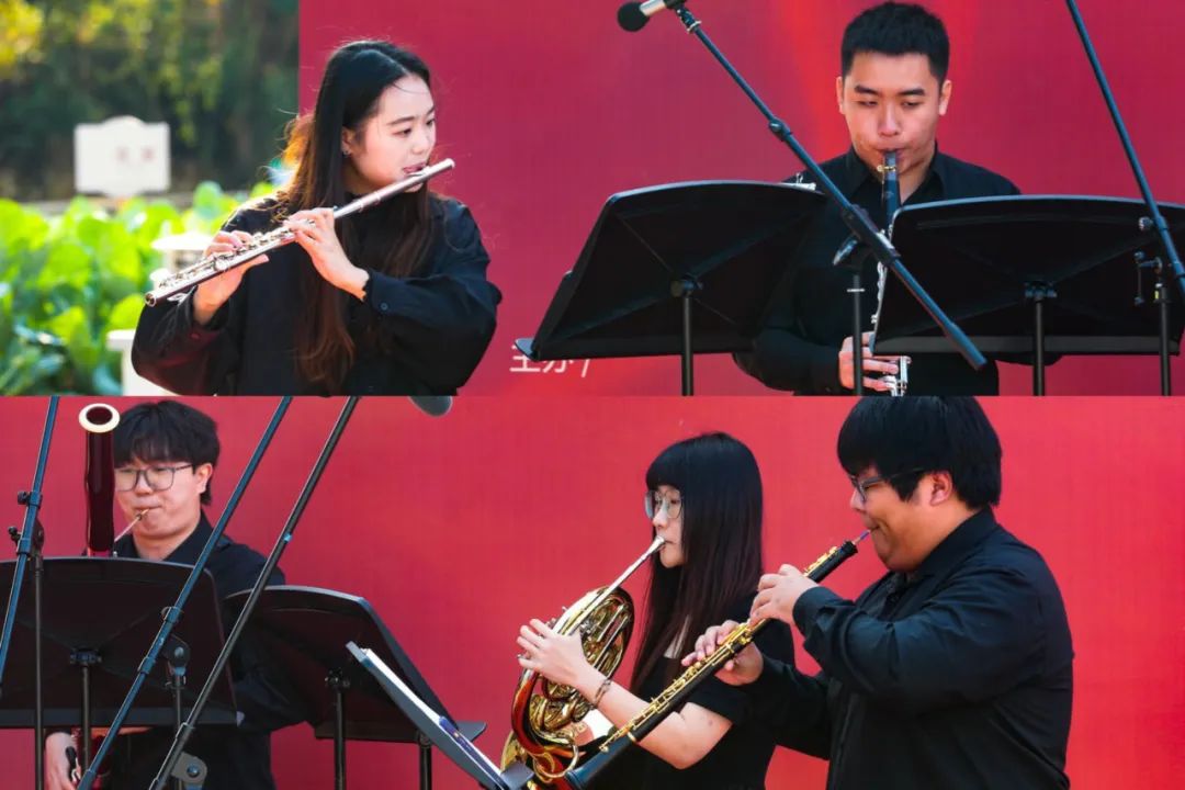 第三阶段,黄俊睿、田益民、郑欣语、宋梦婷、王天行五位同学所组成的木管五重奏为现场带来四首由邬娜、杨光老师改编的经典作品。《唱支山歌给党听》这首乐曲具有民间歌谣体裁的抒情特点,歌词融化在长笛和双簧管中,真挚而热情,歌曲在温暖的和声中收束。紧接着是王洛宾的《在那遥远的地方》,这首歌曲采用了汉族歌曲中鲜见的欧洲七声音阶调式,既有哈萨克名歌的音色,又有青海藏族民歌的风,木管五重奏生动演绎出百姓对祖国山清水秀的热爱之情。随着巴松管气宇轩昂、悠长婉转的独奏,《草原名歌联奏》以热情洋溢的音乐打动着在场的所有观众,这首歌曲吸收了我国北部游牧民族经典民歌的特色,木管们激情浑厚的音色勾勒出一幅蓝天白云下,辽阔草原上牧民们尽情高歌的美妙情景。最后以二胡协奏曲《赛马》收尾,长笛和双簧管模仿烈马在急速奔驰时清脆有力的马蹄声,充满阳刚之气,令人振奋,在骏马奔腾嘶鸣声中,木管五重奏结束了精彩的演奏。