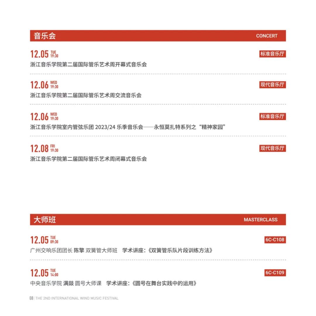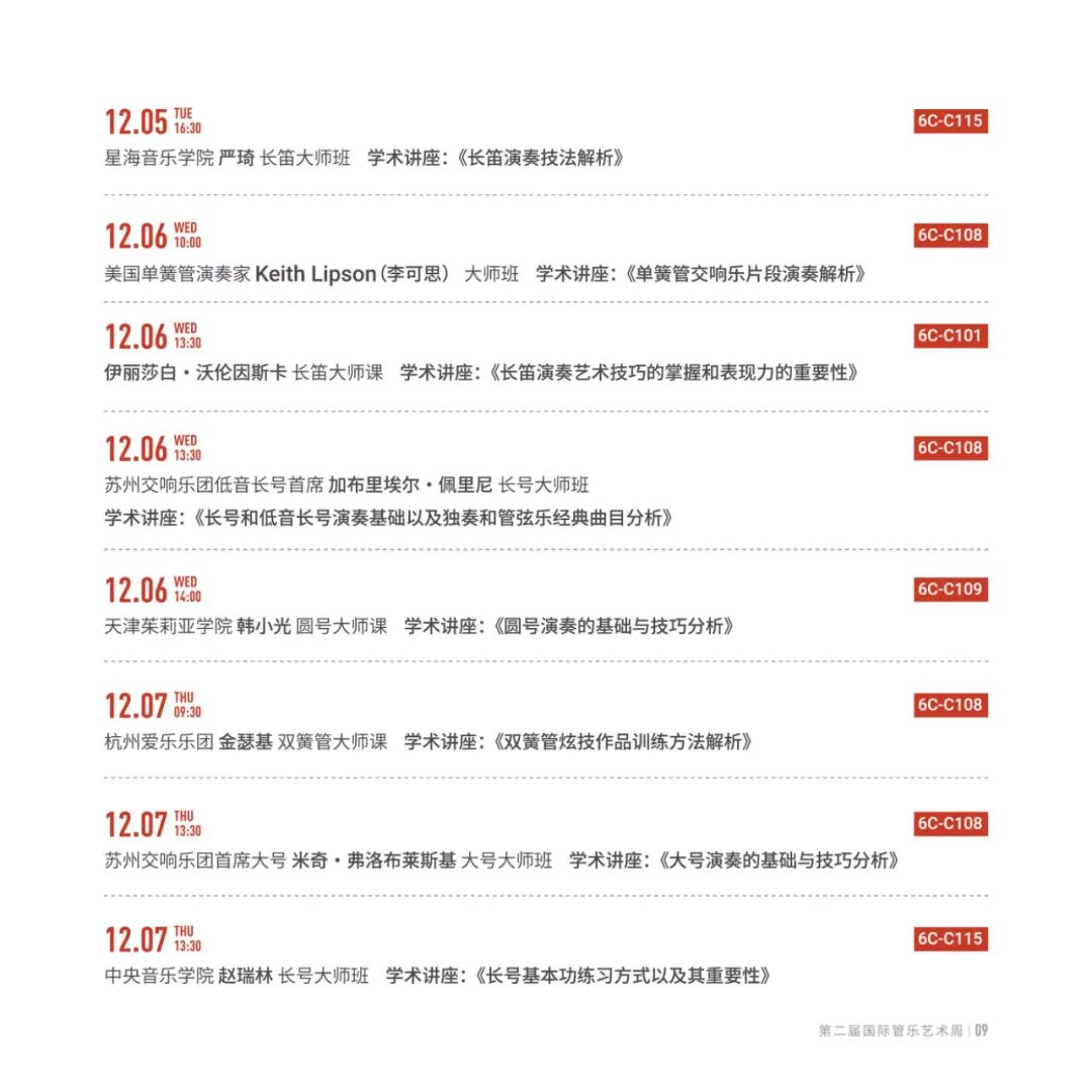 此次艺术周从12月5日至8日,来自中国、俄罗斯、美国、意大利、哥伦比亚、捷克、波兰、韩国等8个国家,包括中央音乐学院、上海音乐学院、西安音乐学院、星海音乐学院、天津茱莉亚学院、浙江音乐学院等全国6所专业音乐院校和新加坡交响乐团、广州交响乐团、苏州交响乐团、浙江交响乐团、杭州爱乐乐团等5所专业院团的30余名管乐艺术家汇聚浙音,开展1场管乐人才研讨会、4场音乐会、17场大师班和学术讲座等活动。