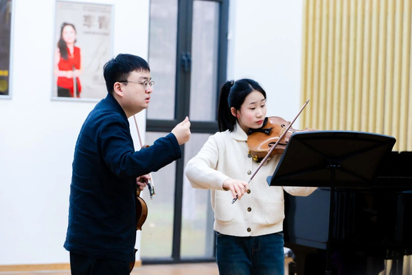 在追求音色纯粹性的复调作品中,梅老师通过指法设计与揉弦控制的精细化调整,帮助学生构建起立体化的情感空间。当涉及现代作品时,他着重强调技术突破与古典框架的平衡,提出“演奏者应当成为联结作曲家创作意图与听众审美体验的桥梁”,通过弓速变化与和声张力的精准把控,让先锋技法焕发古典音乐的诗意内核。
