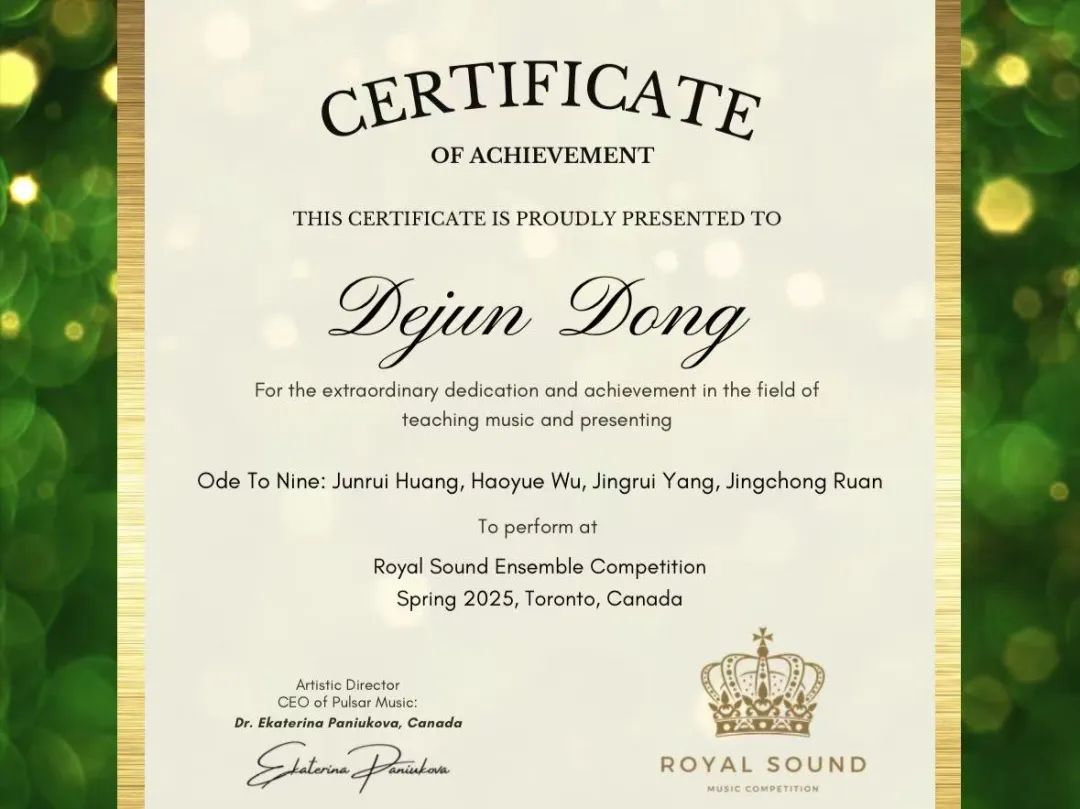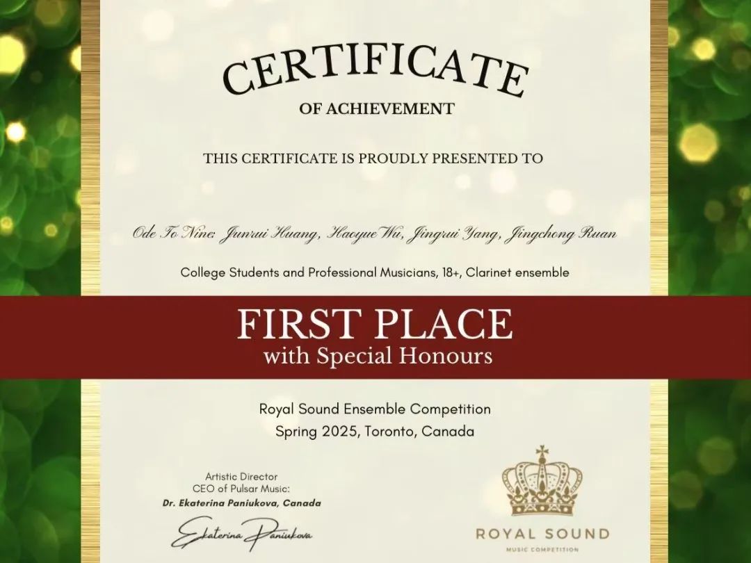 近日,我系“对九当歌”单簧管重奏乐团在2025年加拿大国际音乐大赛中荣获一等奖,指导教师:董德君教授。