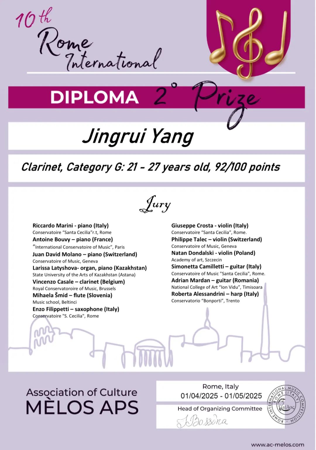 近日,我系本科生杨景瑞在2025年第十届罗马国际音乐大赛中荣获二等奖,指导教师:董德君教授。