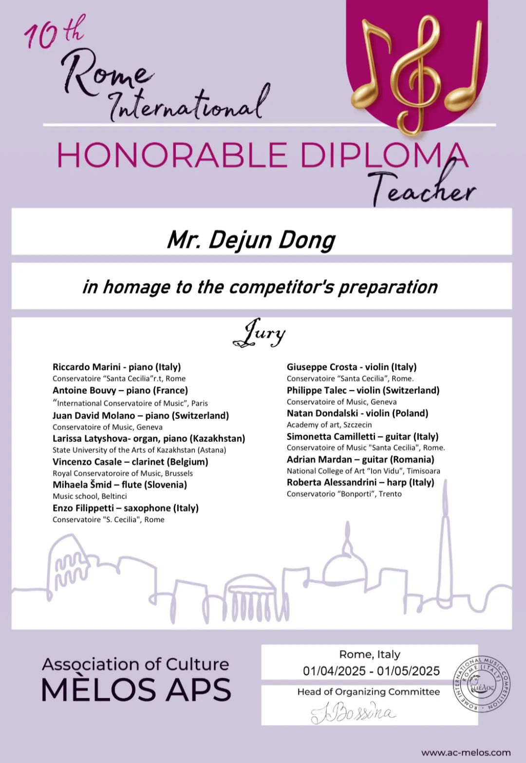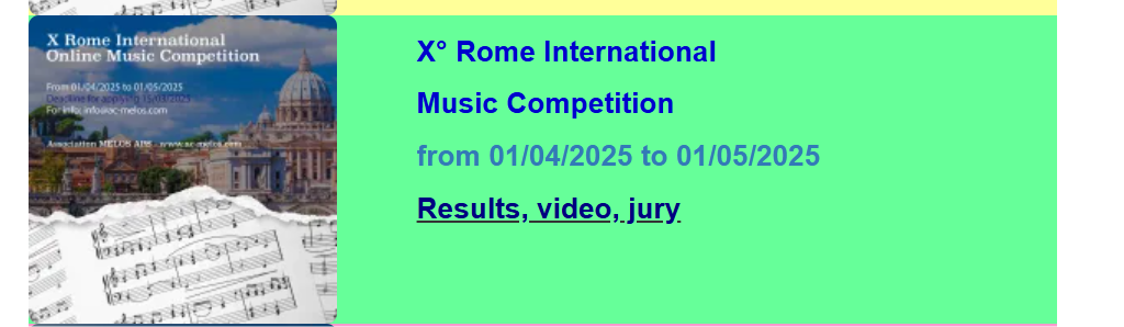 2025第十届罗马国际音乐大赛,是文化协会“Melos APS”(意大利)组织不同乐器和年龄的在线比赛。评委为参赛者提供建议。最佳获奖者可能被邀请到意大利参加大师班和独奏会。