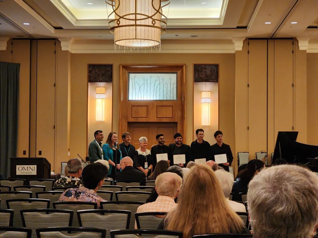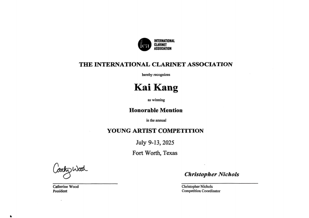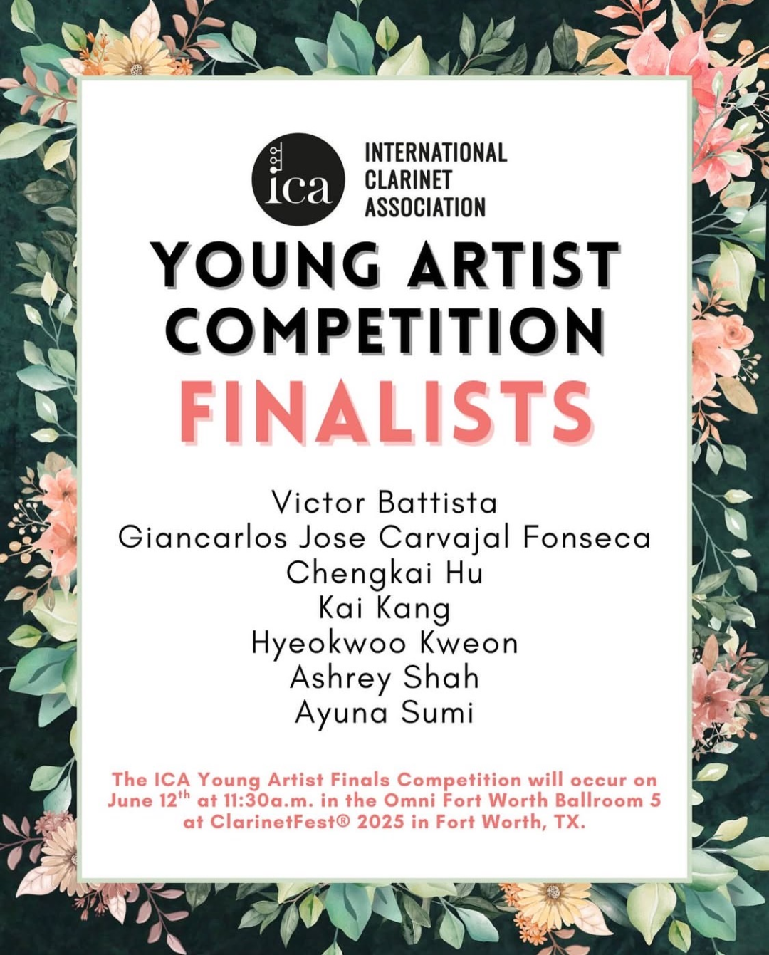 2025年7月12日,2025年国际单簧管协会(ICA)青年艺术家大赛决赛在美国德克萨斯州沃斯堡Omni Fort Worth Hotel的奥姆尼沃斯托弗宴会厅举行,全球共计7名来自中、美、委内瑞拉等各国选手进入最终决赛,我系本科二年级学生康凯、胡成凯作为唯二中国选手双双进入决赛。其中康凯荣获特别荣誉奖,指导教师:董德君教授。