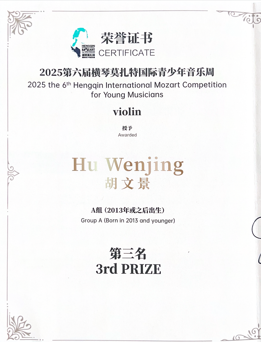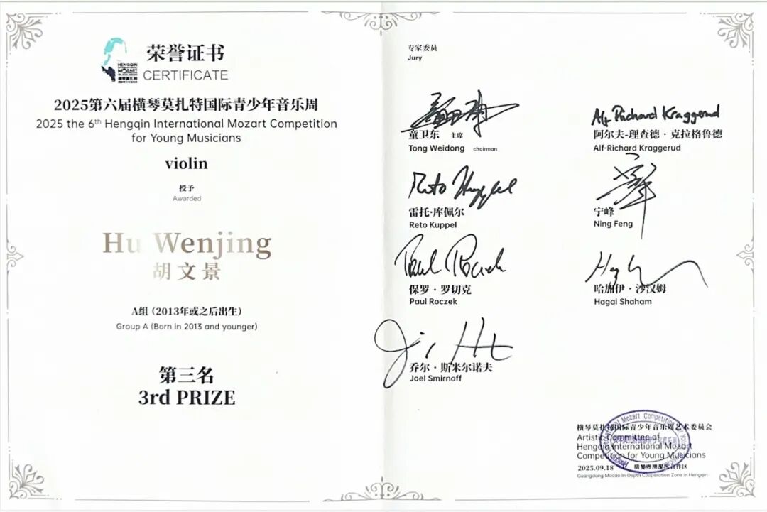 近日,随着2025横琴莫扎特国际青少年音乐周A组四位入围决赛的小选手依序完成了演奏,A组决赛落下帷幕。在此次国际盛事中,浙江音乐学院室内乐学院少年班学员胡文景同学(指导教师:薛飚)荣获小提琴A组第三名和最受观众喜爱奖,获得2,500美元的奖金。