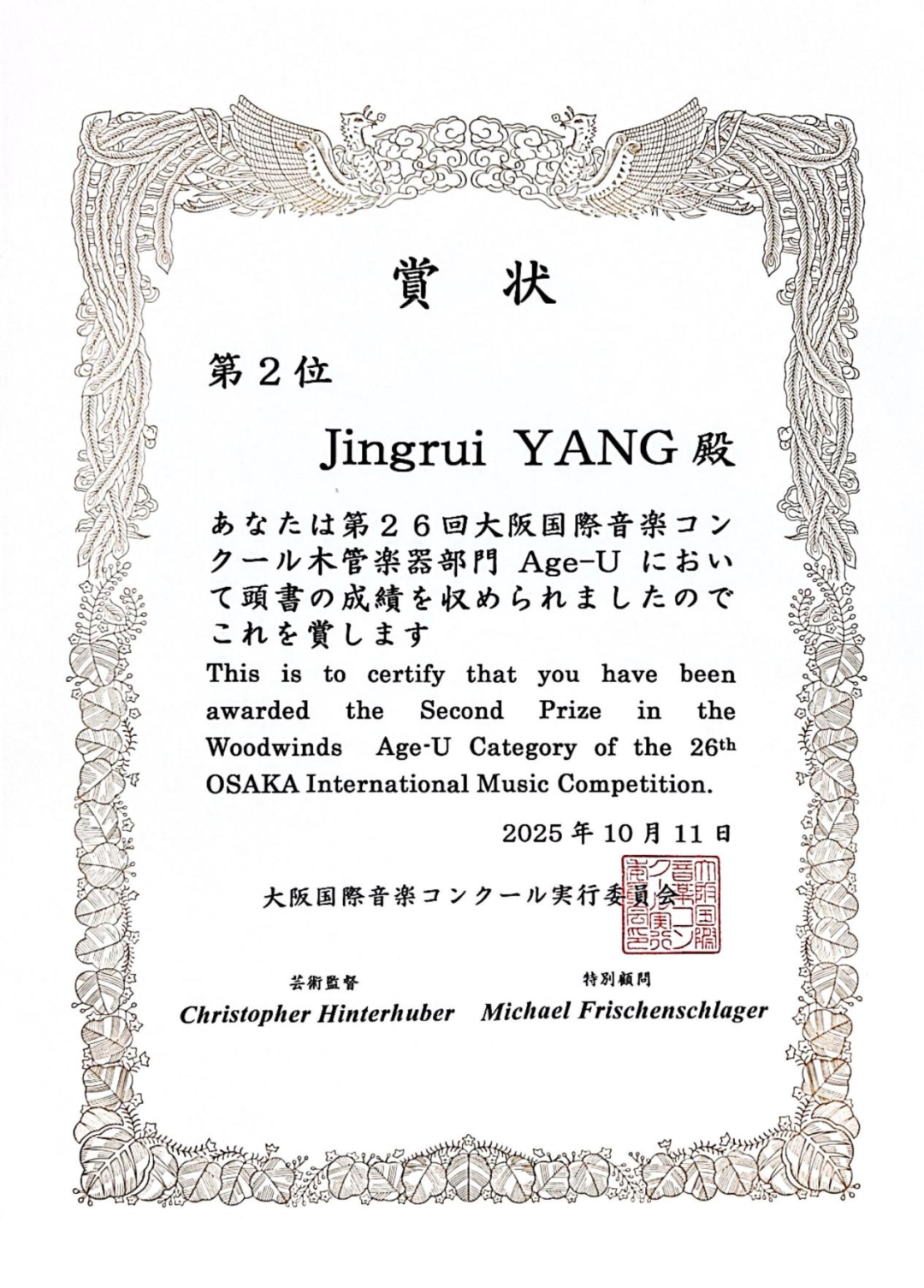 近日,我系本科生杨景瑞在2025第26届大阪国际音乐大赛中荣获第二名,指导教师:董德君教授。
