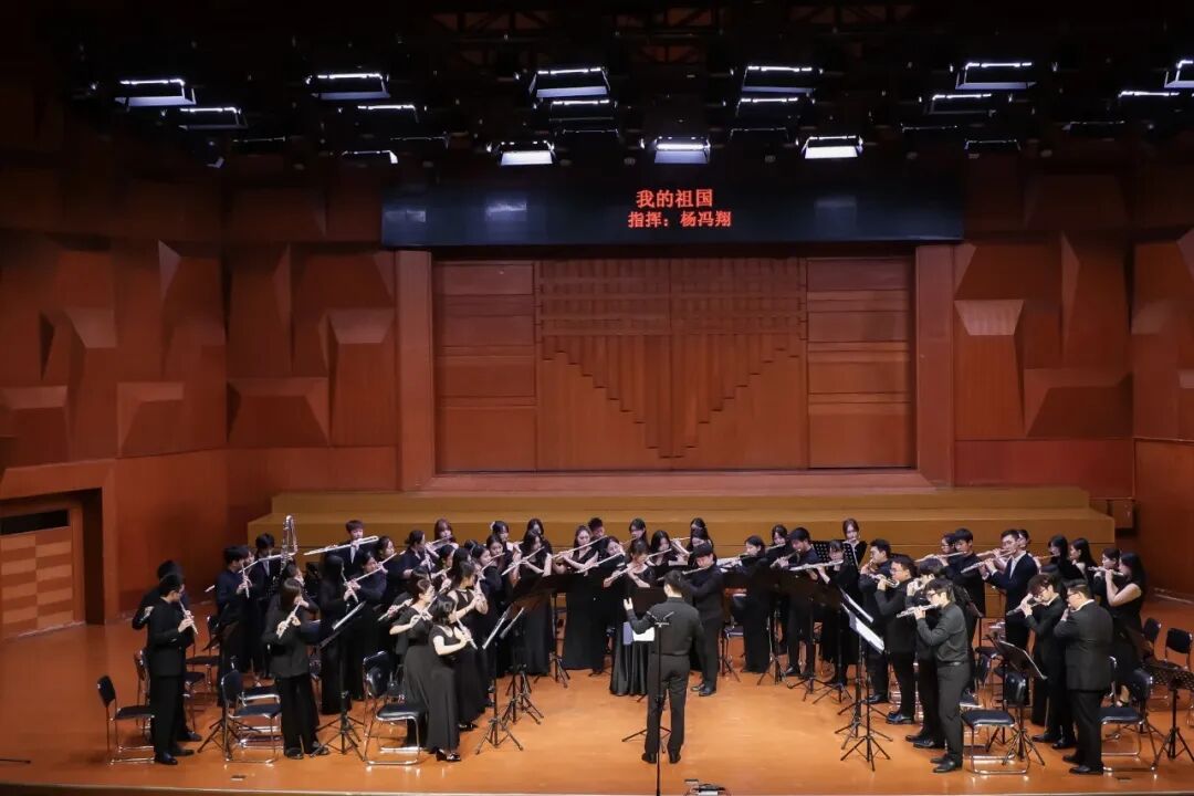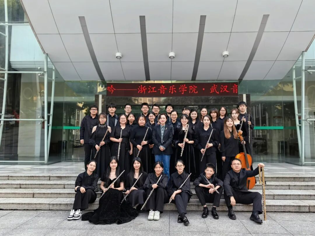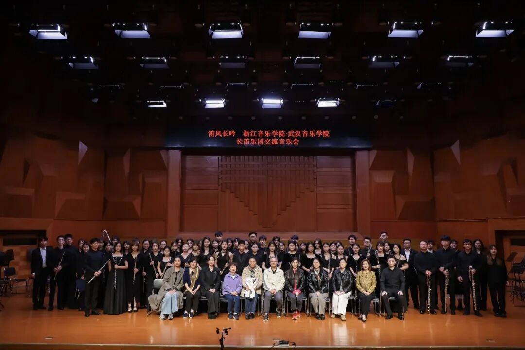 2025年10月28日,浙江音乐学院长笛专业学生在武汉音乐学院编钟音乐厅与武汉音乐学院长笛乐团联袂演出,共同呈现了一场名为“笛风长吟”的长笛艺术交流音乐会。音乐会上,两校师生分别演绎了《自由探戈》、《斯拉夫舞曲》、《紫竹调》和《德沃夏克第九交响曲》等七首风格迥异的经典作品,最终在联合乐团悠扬的《我的祖国》旋律中圆满落幕。此次交流活动不仅为两校长笛专业建设及人才培养搭建了重要交流平台,更全面彰显了长笛艺术的独特魅力,以及音乐教育在实践与学术领域的执着追求。