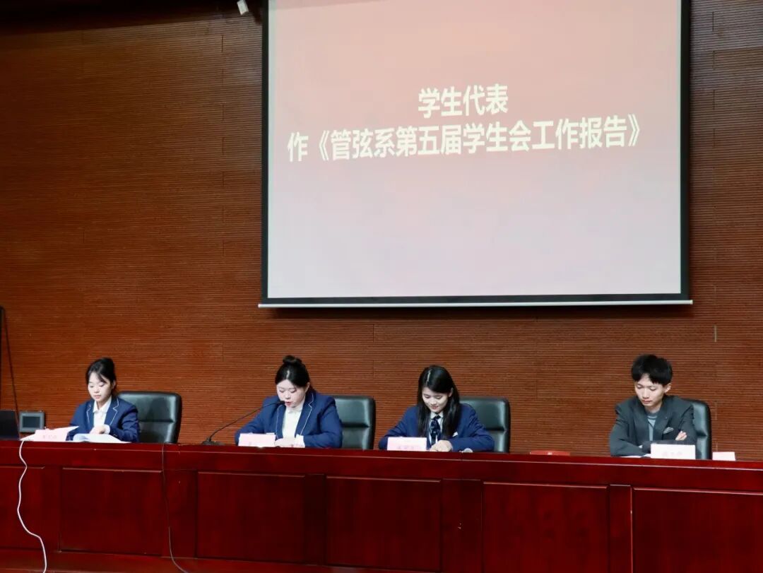 在预备会议阶段,代表们听取了大会筹备工作报告、审议通过了《代表资格审查委员会名单》《代表资格审查报告》《大会主席团名单》《大会议程》。大会上听取第五届主席团成员朱可儿作浙江音乐学院管弦系第六次学生代表大会筹备工作报告;听取、审议并通过了第五届主席团成员吴语瞳代表管弦系第五届学生会作的题为《为中国式现代化挺膺担当,为建设一流音乐学院贡献青春力量》的工作报告。报告回顾了管弦系一年来的学生会的主要工作和工作成绩,并对接下来一年的工作进行了规划和展望:扎实学习专业知识,紧跟国家发展步伐,在强国建设、民族复兴的伟大征程中,展现青春担当,贡献青春力量,共同谱写浙江音乐学院管弦系学生工作的新篇章。