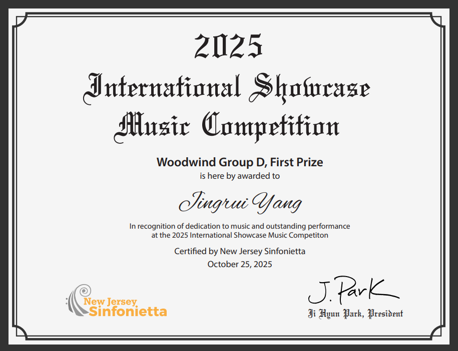 杨景瑞,浙江音乐学院管弦系2022级单簧管专业本科生,师从浙江音乐学院董德君教授。曾获浙江音乐学院2022-2023学年专业优秀一等奖学金。于2023-2024学年前往西班牙比戈高等音乐学院跟随Esteban Valverde教授学习单簧管专业知识并取得专业满分成绩。2025年入选浙江音乐学院“叔同学院”拔尖人才培养计划。荣获2025年加拿大国际音乐大赛一等奖、2025第26届大阪国际音乐大赛木管组第二名(单簧管第一名)、2025挪威国际音乐大赛二等奖、十届罗马国际音乐大赛二等奖。于2025年8月在德国Fondation Oberlinger管风琴博物馆受邀参演,并得到当地政府和观众的一致好评。