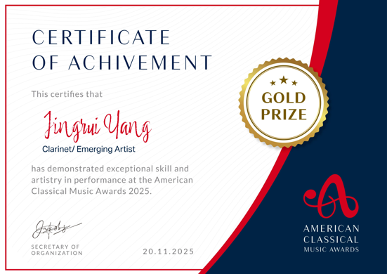 杨景瑞:男,现年21岁,浙江音乐学院管弦系2022级单簧管专业本科生,师从浙江音乐学院董德君教授。曾获浙江音乐学院2022-2023学年专业优秀一等奖学金。于2023-2024学年前往西班牙比戈高等音乐学院跟随Esteban Valverde教授学习单簧管专业知识并取得专业满分成绩。2025年入选浙江音乐学院“叔同学院”拔尖人才培养计划。荣获2025年德国国际音乐大赛一等奖、加拿大国际音乐大赛一等奖、第26届大阪国际音乐大赛木管组第二名(单簧管第一名)、挪威国际音乐大赛二等奖、第十届罗马国际音乐大赛二等奖。曾于2025年8月在德国Fondation Oberlinger管风琴博物馆受邀参演,并得到当地政府和观众的一致好评。
