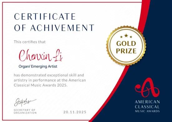 李陈欣:浙江音乐学院管弦系2022级管风琴专业学生。五岁开始学习钢琴,2021年开始学习管风琴,2022年考入浙江音乐学院管弦系管风琴专业,跟随留德归来的管风琴青年演奏家李艺花副教授学习管风琴、羽管键琴。在校期间还受到了德国斯图加特国立音乐与表演艺术大学管风琴系主任、教授、博士Vincent Bernhardt教授和Jörg Halubek教授,以及“全球管风琴大使”法国管风琴家Olivier Latry,德国著名管风琴家,钢琴家Ulrich Walther教授的指点。于2025年8月在德国Fondation Oberlinger管风琴博物馆受邀参演,得到当地政府和观众的一致好评。曾获得2023-2024学年浙江音乐学院单项奖奖学金,第九届中国青少年比赛蜂鸟音乐奖浙江(杭州)赛区室内乐专业组一等奖。参与项目《华韵乐使——奏响“一带一路”沿线好声音的首款国产管风琴》获得2024年第十四届“挑战杯”秦创原中国大学生创业计划竞赛主体赛金奖。