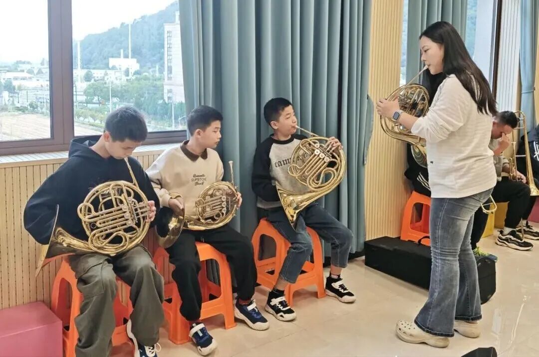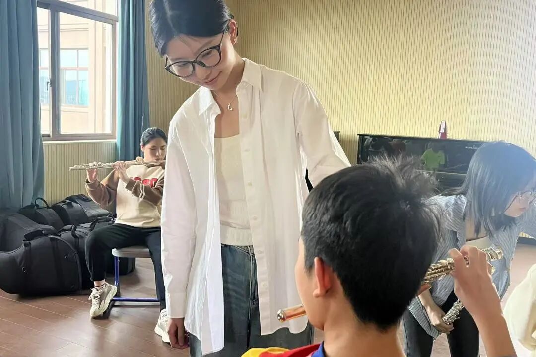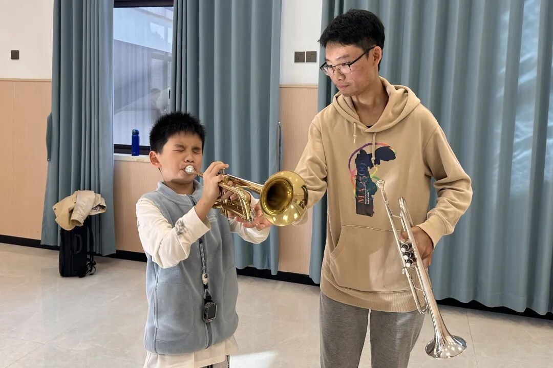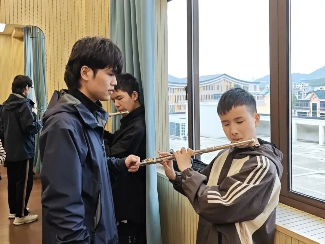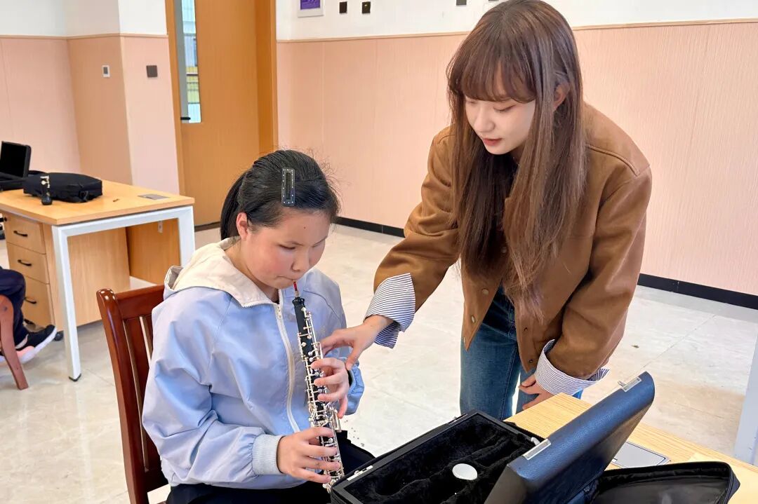 考虑到省盲校同学们的学习特点,大家特意放慢教学节奏,通过手把手的示范和耐心的听觉辨析指导。为了让同学们准确把握音准节奏,他们一边哼唱旋律,一边用手辅助调整演奏姿势;为了帮助纠正气息控制,他们贴近乐器倾听声音变化,逐句拆解演奏技巧。从乐器基础构造的触摸认知,到感受发声位置、吹奏乐器的气息角度、简单旋律的反复练习,每一个教学环节都凝聚着管弦学子的用心,让省盲校同学们在听觉与触觉的双重感知中,逐步解锁音乐的无限可能。管弦系的学子们在教学中学会了换位思考,用更包容、更耐心的态度对待每一个求知的心灵;而省盲校同学们坚韧不拔的学习精神,也深深感染着每一位浙音学子,让大家更加懂得珍惜与感恩。