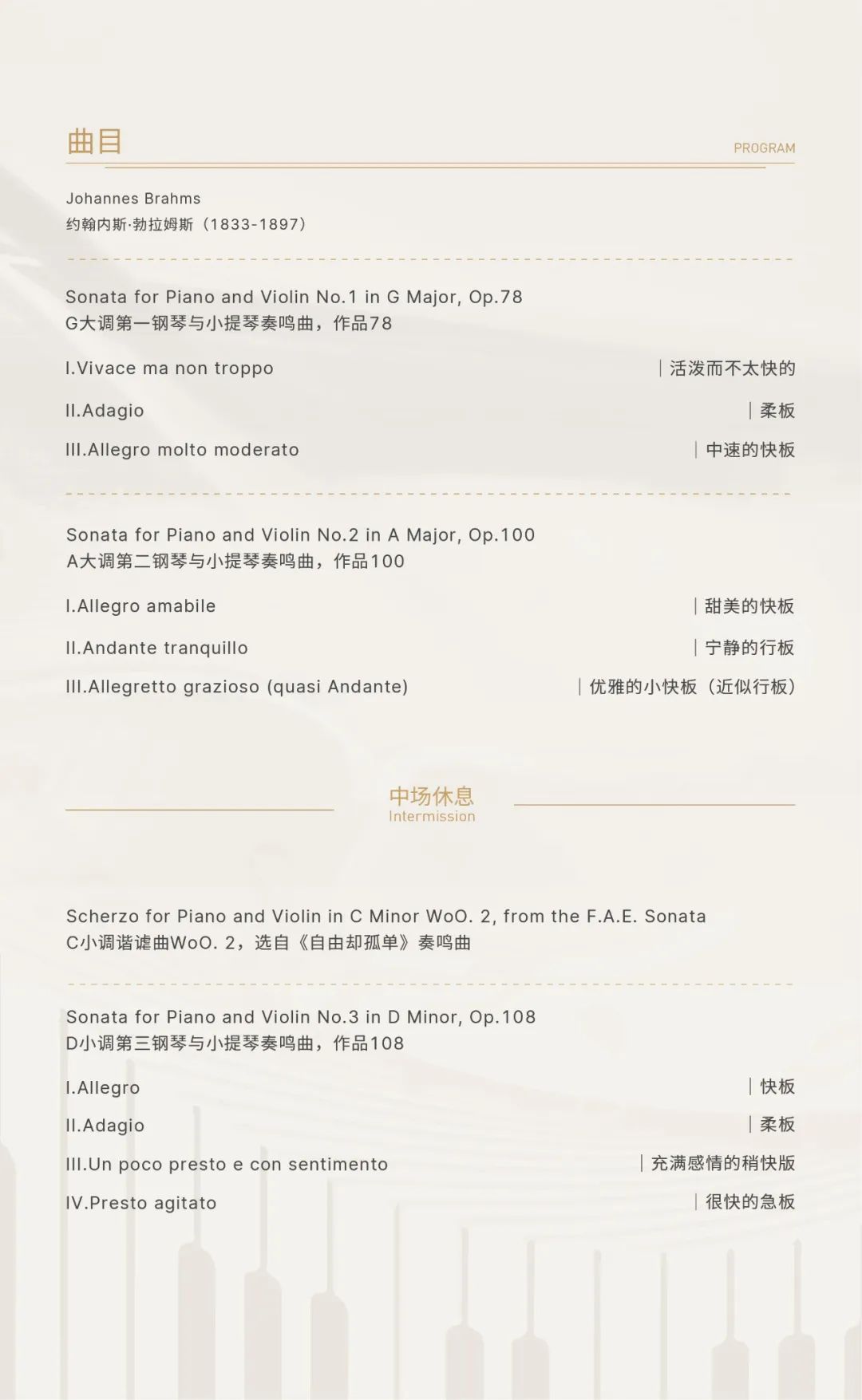 【预告】宁峰、左章演绎勃拉姆斯钢琴与小提琴奏鸣曲全集